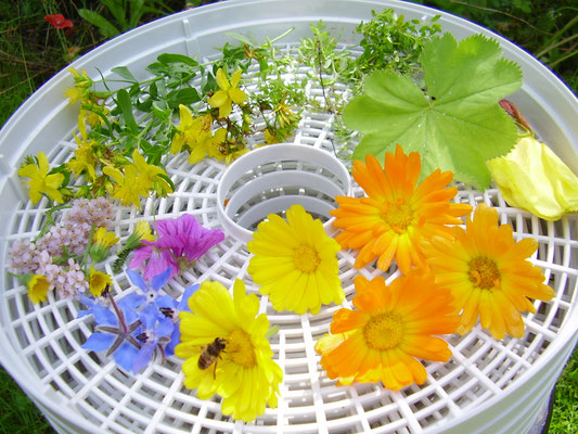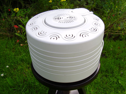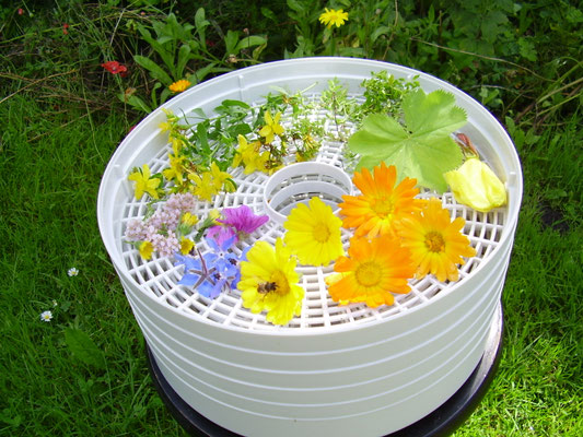 In diesem oft eher feuchten Sommer habe ich zum ersten Mal meinen Dörrapparat genutzt, um Kräuter zu trocknen. Es ist derzeit selbst an den trockenen Tagen oft eine hohe Luftfeuchtgkeit vorhanden und die Gefahr, dass Malve, Ringelblumen und andere eher "wässrige" Blüten oder Kräuter Schimmel ansetzen ist mir da einfach zu hoch.